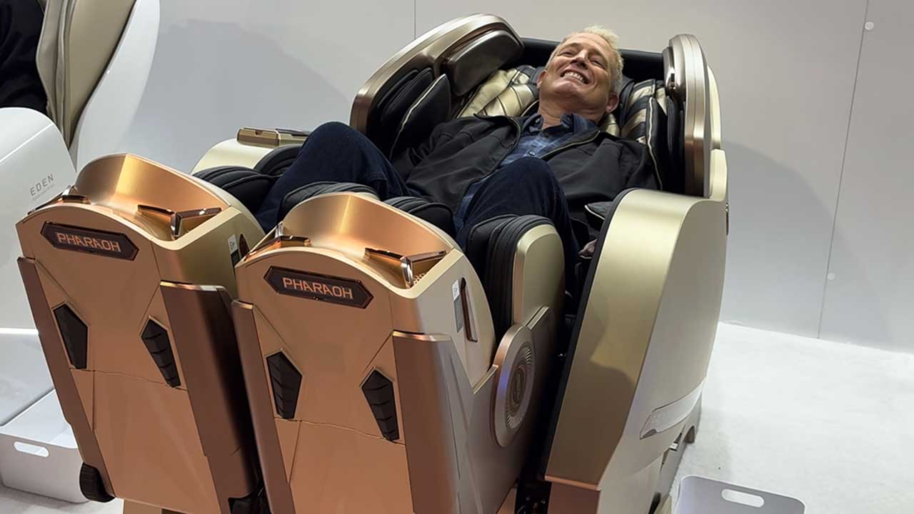 This isn't the only massage product that caught my attention. As you can see from the smile on my face, Pharaoh S II Massage Chair Developed by a company called Bodyfriend, this product is the first of its kind to offer separate leg movements and stretches. Pads on the sides of your shoulders draw you into a massage action unlike any previous massage chair experience.