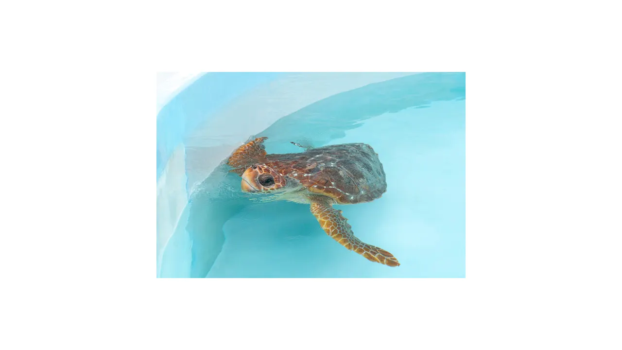 This photo provided by the Loggerhead Marine Life Center in Juno Beach, Florida, on Monday, May 13, 2024, shows a subadult found with a hook attached to its shoulder in late April at the Loggerhead Marine Life Center in Juno Beach, Florida. Finley the loggerhead turtle is pictured. Administration of antibiotics to prevent possible infection. Finley was released into the Atlantic Ocean on Monday morning. (Loggerhead Sea Turtle Marine Life Center, via AP)