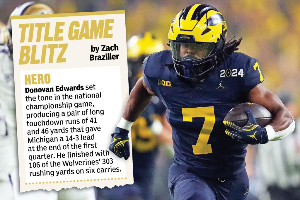From Hero, Zero, and Full Blitz The University of Michigan defeated Washington 34-13 in the College Football Playoff Championship Game. Hero Donovan Edwards set the tone, scoring touchdown runs of 41 and 46 yards to give Michigan a 14-3 lead at the end of the first quarter. He gained 106 of the Wolverines' 303 rushing […]