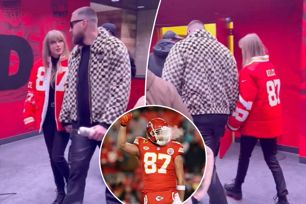 Taylor Swift and Travis Kelce hold hands leaving frigid Chiefs vs. Dolphins playoff game
