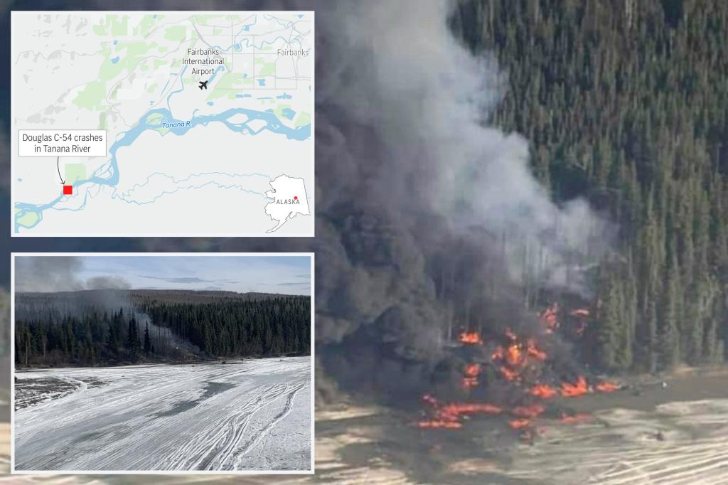 A plane carrying two people crashed into an icy Alaska River and burst into flames on Tuesday, with “no survivors found,” police said. Investigators said the Douglas DC-4 Skymaster crashed into the Tanana River at 10:03 a.m., minutes after takeoff from Fairbanks International Airport. “The aircraft skidded into a steep hill on the riverbank, where […]