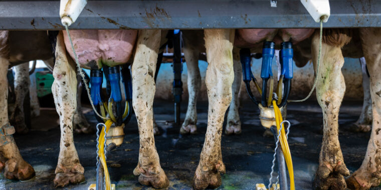 Enlarge / Cows being milked in Wisconsin on May 8, 2024. The H5N1 bird flu appears to be stampeding through dairy farms in California, the country’s largest milk producer. Over the weekend, the total number of confirmed infected cow herds stunningly doubled, going from 17 last Thursday to 34 Monday morning, according to state and […]