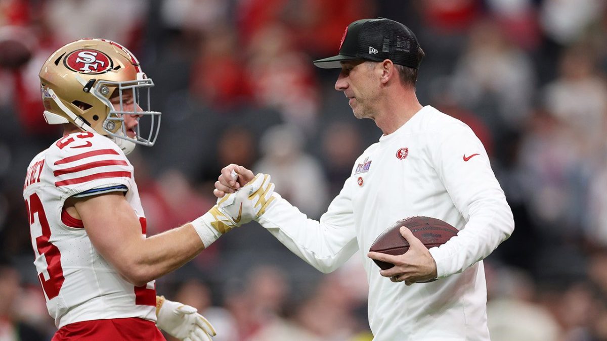 San Francisco 49ers head coach Kyle Shanahan (right) talks with Christian McCaffrey before the Super Bowl against the Kansas City Chiefs on Feb. 11, 2024 at Allegiant Stadium in Las Vegas. (Ezra Shaw/Getty Images)