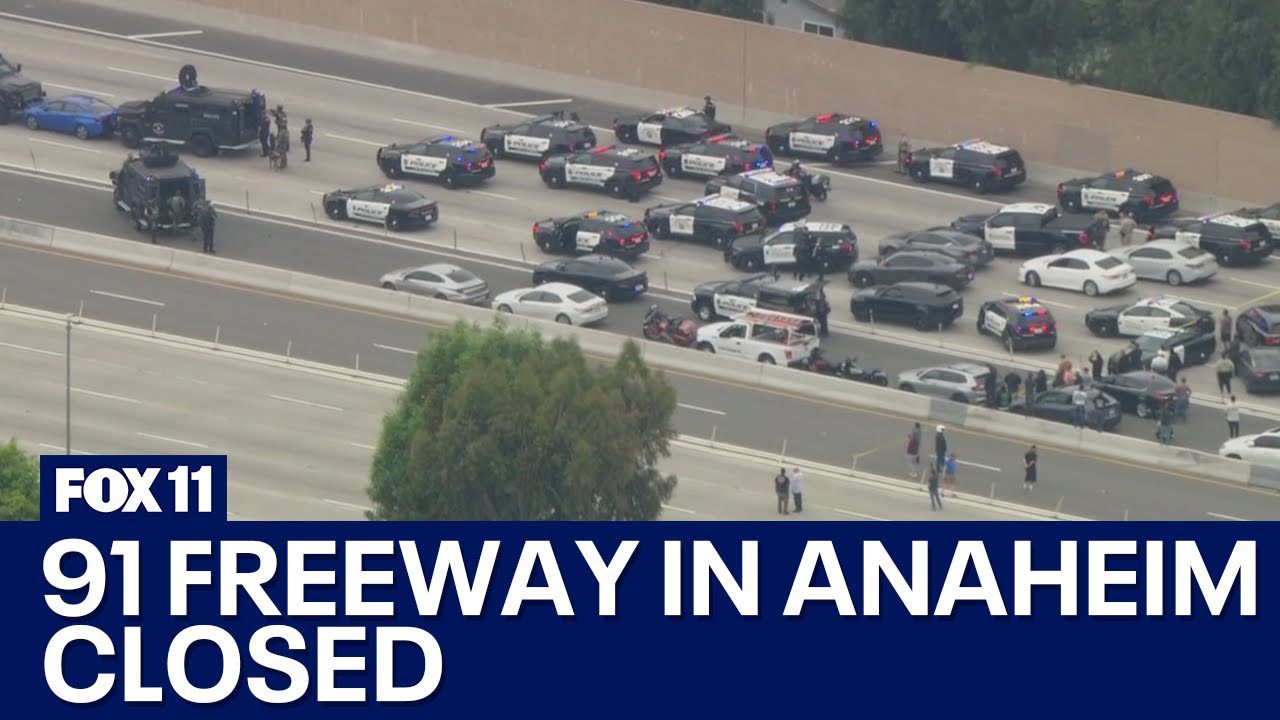 Traffic on the 91 Freeway in Anaheim near Lakeview is at a standstill after a pursuit came to an end. SkyFOX is live over the scene …