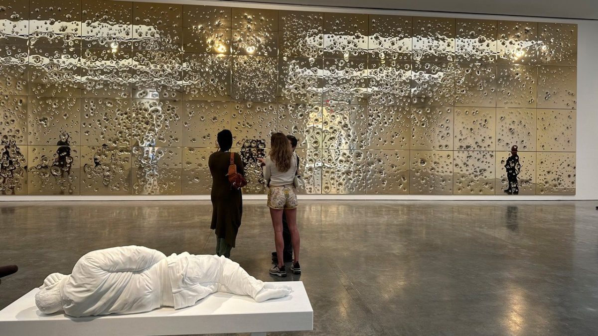 But the third impression is perhaps the most striking: Look closely and you’ll see your own golden reflection, and if you take a selfie, as many viewers have done in the last month, you’ll see yourself riddled with bullet holes.