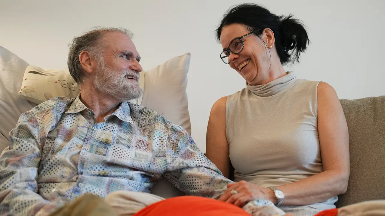 Michael Bommer (left), who is terminally ill with colon cancer, looks on as his wife, Annette Bommer (right), at their home in Berlin, Germany, on May 22, 2024. (AP Photo/Markus Schreiber)