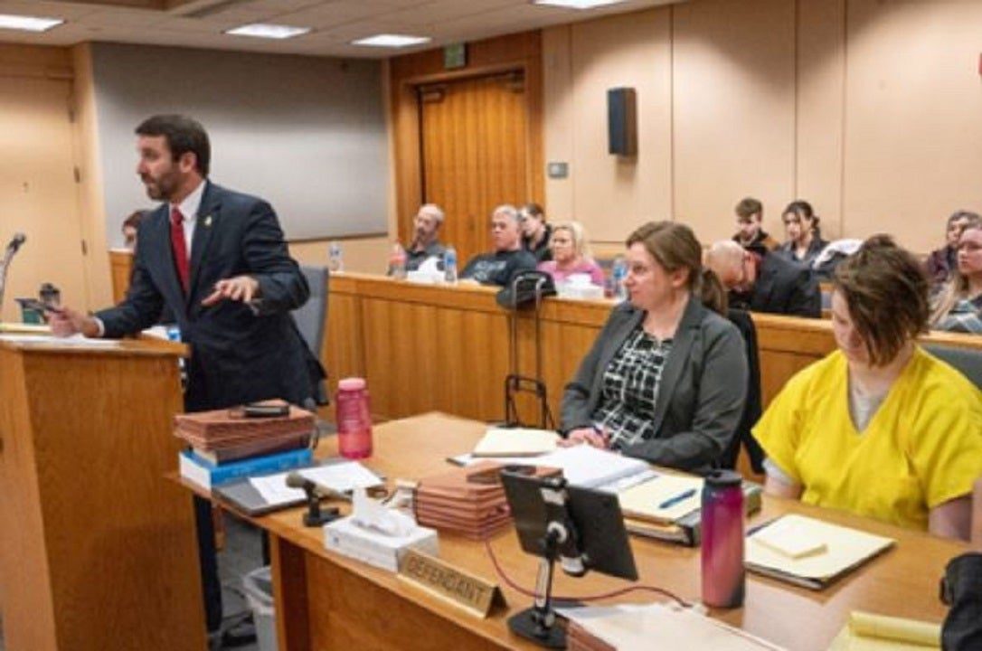 Denali Bremer sits next to defense attorney Emily Cooper in an Alaska courtroom. Bremer was sentenced to 99 years in prison in 2019 for the murder of Cynthia Hoffman. (Alaska Department of Justice)