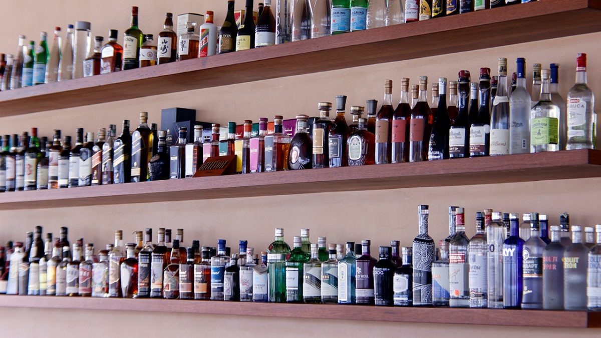 Liquor bottles on a bar shelf