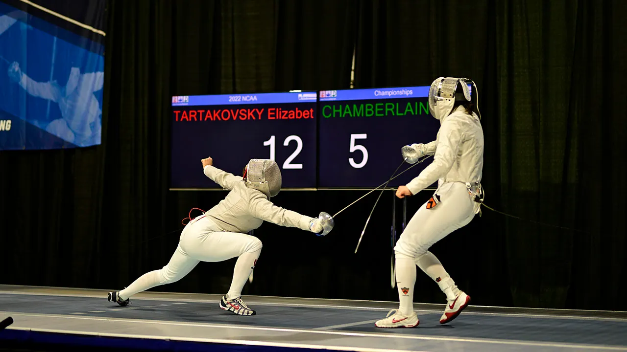 Elizabeth Tartakovsky of Harvard University competes against Maia Chamberlain of Princeton in the first Saber semifinal of the Division I Women’s Fencing Championships on March 25, 2022 at Castellan Family Fencing Center in Notre Dame, Indiana. do. (Mark Lebrick/NCAA Photo via Getty Images)