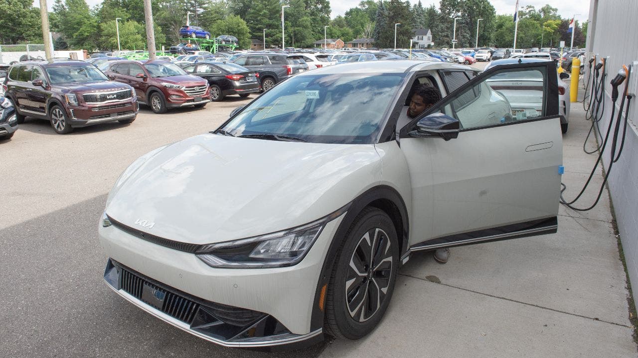 A Kia EV6 electric vehicle (EV) is charging at the LaFontaine Kia dealership on July 13, 2023 in Detroit, Michigan. (Matthew Hatcher/Bloomberg via Getty Images/Getty Images)