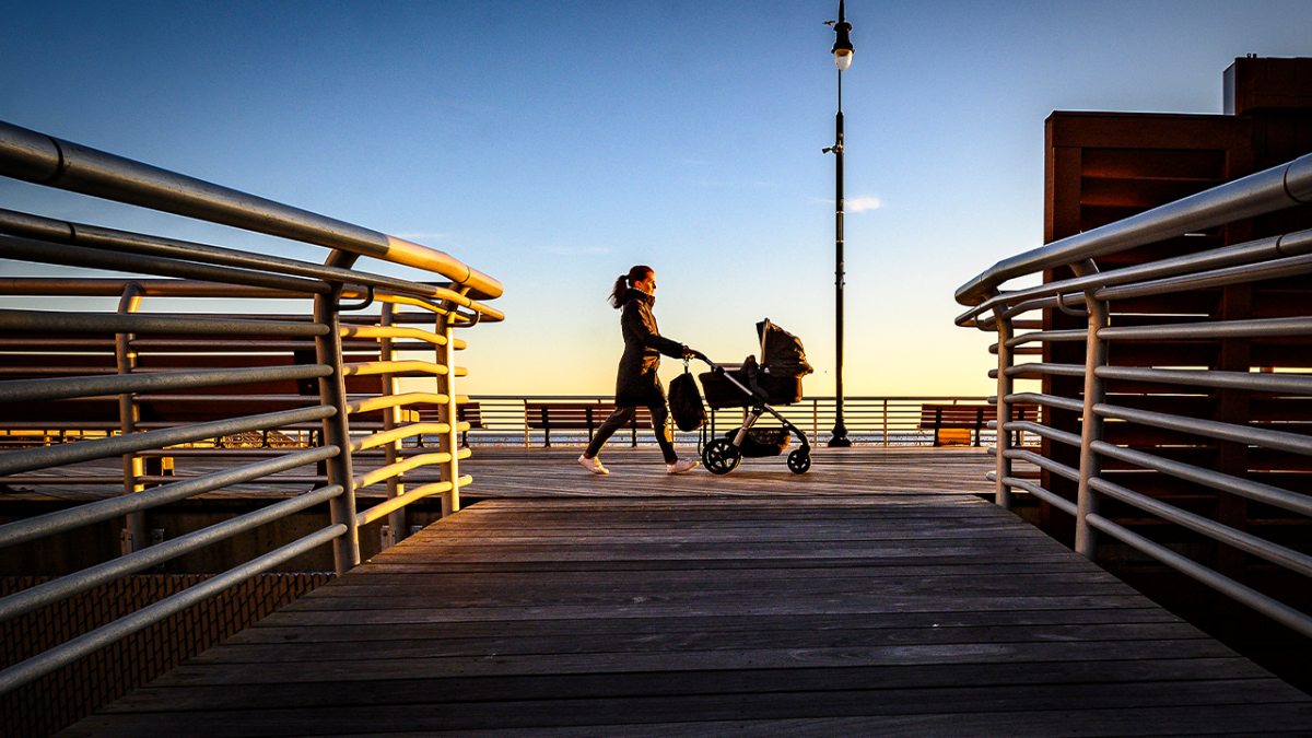 A woman pushes a stroller while walking along the boardwalk in Long Beach, New York on November 13, 2019. (Getty Images)
