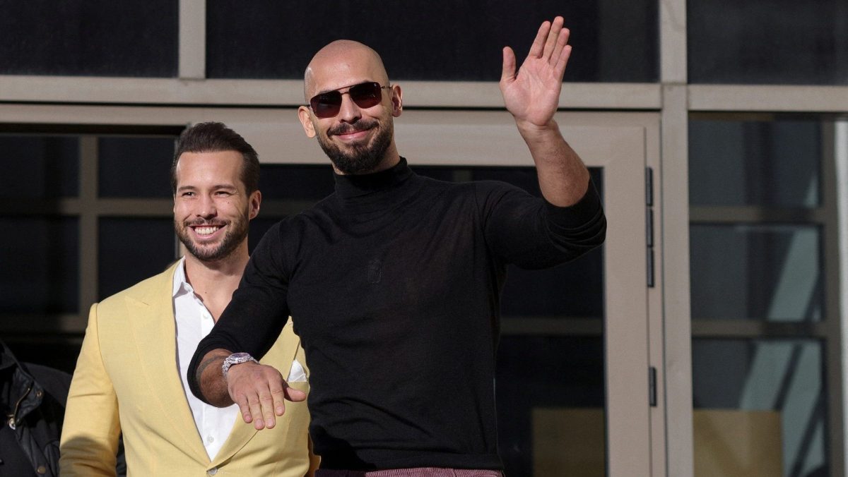 Andrew Tate is waving as he leaves Bucharest Court on January 9, 2025 with his brother Tristan Tate in Bucharest, Romania. (Inquiry photo via Reuters/octav ganea)