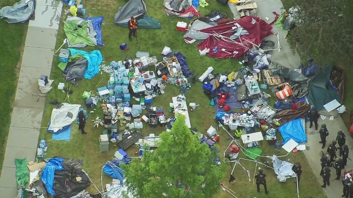 Video footage taken by news crews on campus showed protesters clashing with police in riot gear, and clean-up crews dismantling dozens of tents and carrying away bags of trash that had accumulated at the encampment.