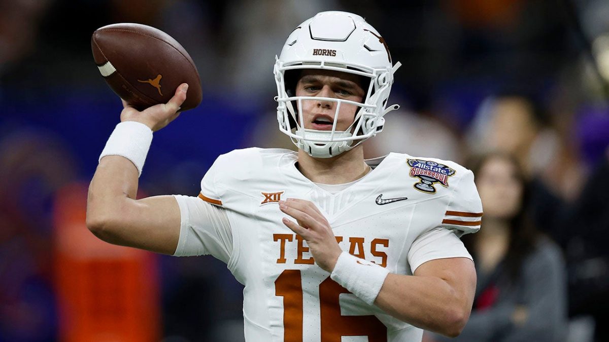University of Texas Longhorns player Arch Manning warms up before the CFP semifinal Allstate Sugar Bowl game against the Washington Huskies at Caesars Superdome in New Orleans on January 1, 2024. (Chris Greisen/Getty Images)