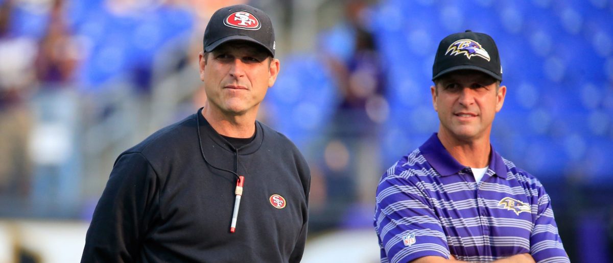 PITTSBURGH, PA – JANUARY 03: Michigan coach Jim Harbaugh (R) celebrates with his brother, head coach John Harbaugh (L) of the Baltimore Ravens after the Ravens defeated the Pittsburgh Steelers 30-17 in their AFC Wild Card game at Heinz Field on January 3, 2015 in Pittsburgh, Pennsylvania. Jamie Squire/Getty Images