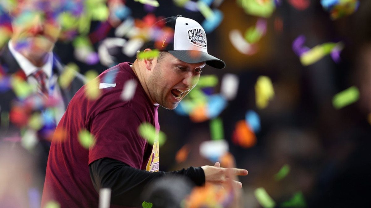 Arizona State Sun Devils head coach Kenny Dillingham celebrates their victory in the Big 12 Championship Game against the Iowa State Cyclones on December 7, 2024 at AT&T Stadium in Arlington, Texas. (Tim Heitman/Imagine Images)