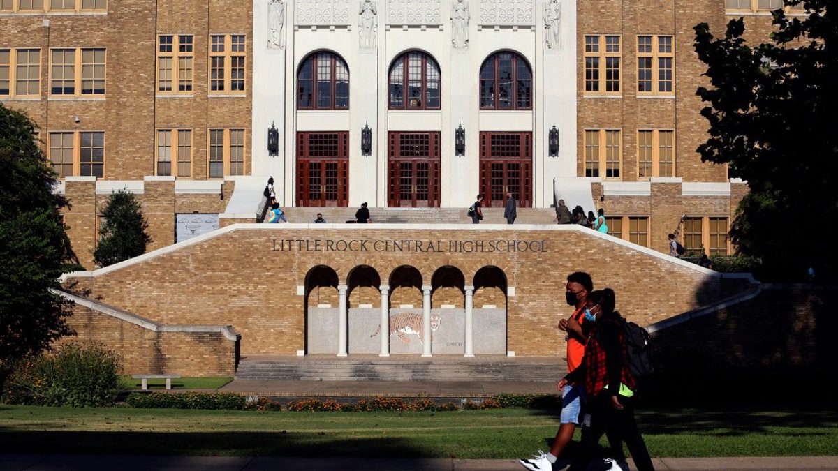 Students head to Little Rock Central High School on Monday, August 24, 2020, for the first day of classes in the Little Rock School District. On Tuesday, May 7, 2024, a federal judge ruled that the state of Arkansas cannot prevent two high school teachers from discussing critical race theory in their classrooms, but prohibits the state from “indoctrination” in public schools. The court ruled that this did not amount to a broader deterrent. The ban is being challenged by two teachers and two students from Little Rock Central High School, the site of the 1957 desegregation crisis. (Tommy Messe/Arkansas Democrat-Gazette, via AP)