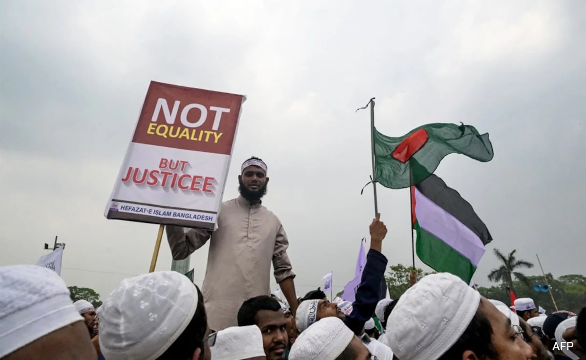 Approximately 20,000 participants convened near Dhaka University, carrying signs with messages like “say no to our women’s Western laws, and it’s going to be Bangladesh’s rise.” Most attendees were students and teachers from non-governmental madrasas, often referred to as “Kowumi.”
