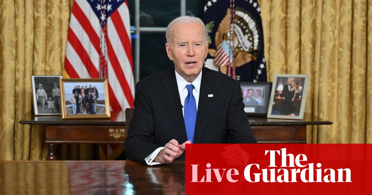 “,”elementId”:”7b2fd152-6d22-4c07-aafe-8826cd0fb5a4″}],”attributes”:{“pinned”:false,”keyEvent”:true,”summary”:false},”blockCreatedOn”:1736990597000,”blockCreatedOnDisplay”:”20.23 EST”,”blockLastUpdated”:1736991087000,”blockLastUpdatedDisplay”: “20.31 EST”,”blockFirstPublished”:1736990767000,”blockFirstPublishedDisplay”:”20.26 EST”,”blockFirstPublishedDisplayNoTimezone”:”20.26″,”title”:”Biden's farewell speech expresses gratitude and warning”,”contributors”:[],”primaryDateLine”:”Wednesday 15 January 2025 20.35 EST”,”secondaryDateLine”:”First published Wednesday 15 January 2025 19.30 EST”},{“id”:”67885c178f08f12e2524184c”,”elements”:[{“_type”:”model.dotcomrendering.pageElements.TextBlockElement”,”html”:”