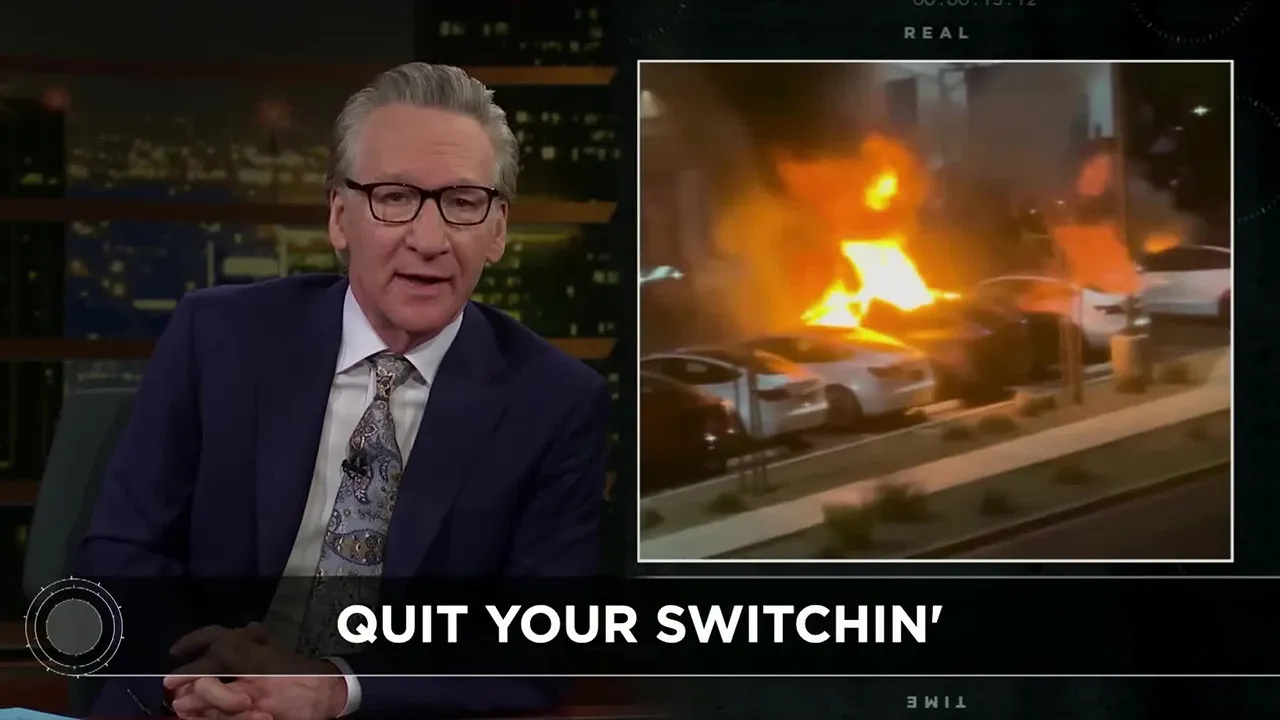 Maher pointed out that Americans often flip their opinions based simply on which political group is making the claims. “They just care about which side is saying something,” he remarked, illustrating his point with footage of Teslas burning at a dealership.