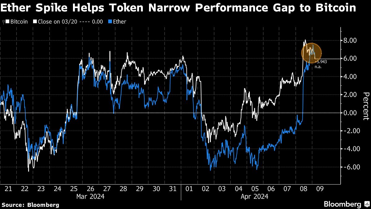 (Bloomberg) — Ether has captured the attention of cryptocurrencies with its biggest gain in more than a month. The jump was in conjunction with speculation about the prospects for a U.S. exchange-traded fund (ETF) application to open the token.