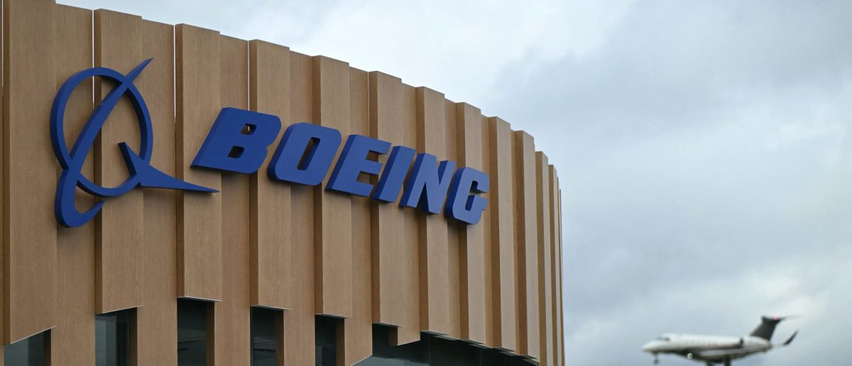 The logo of American aircraft manufacturer Boeing is displayed during the Paris Air Show at Le Bourget airport in Paris on June 20, 2023. (Photo by GEOFFROY VAN DER HASSELT/AFP via Getty Images)