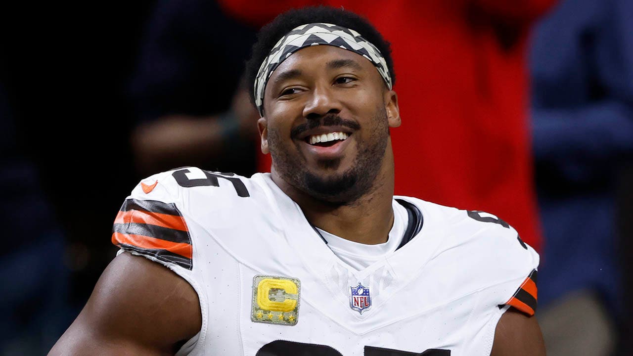 Cleveland Browns defensive end Myles Garrett warms up before a game against the Saints on Sunday, Nov. 17, 2024 in New Orleans. (AP Photo/Butch Dill)