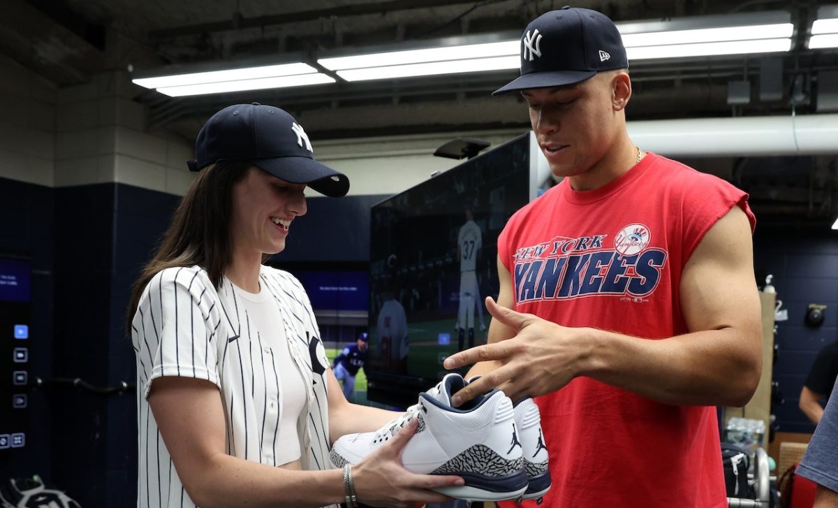 Aaron Judge presented Caitlin Clark with his cleats before the Texas Rangers and New York Yankees game at Yankee Stadium. (New York Yankees/Getty Images)
