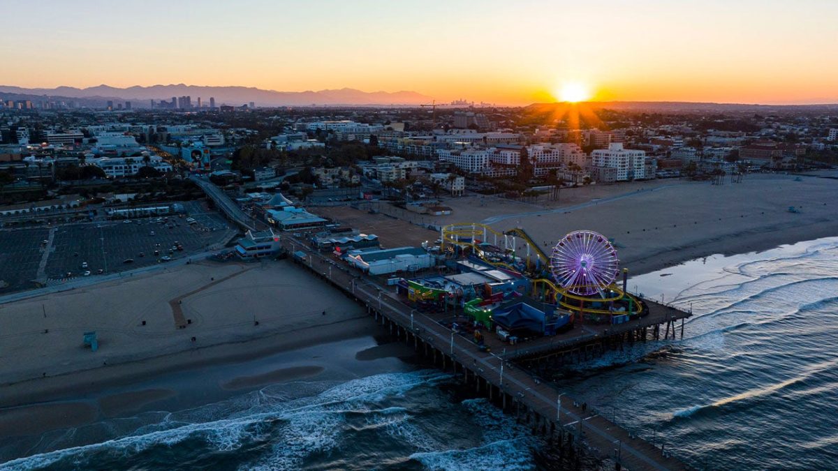 Sunrise view of the neon-lit Santa Monica Pier and Ferris wheel at dawn in California. (Visions of America/Joseph Sohm/Universal Images Group via Getty Images)