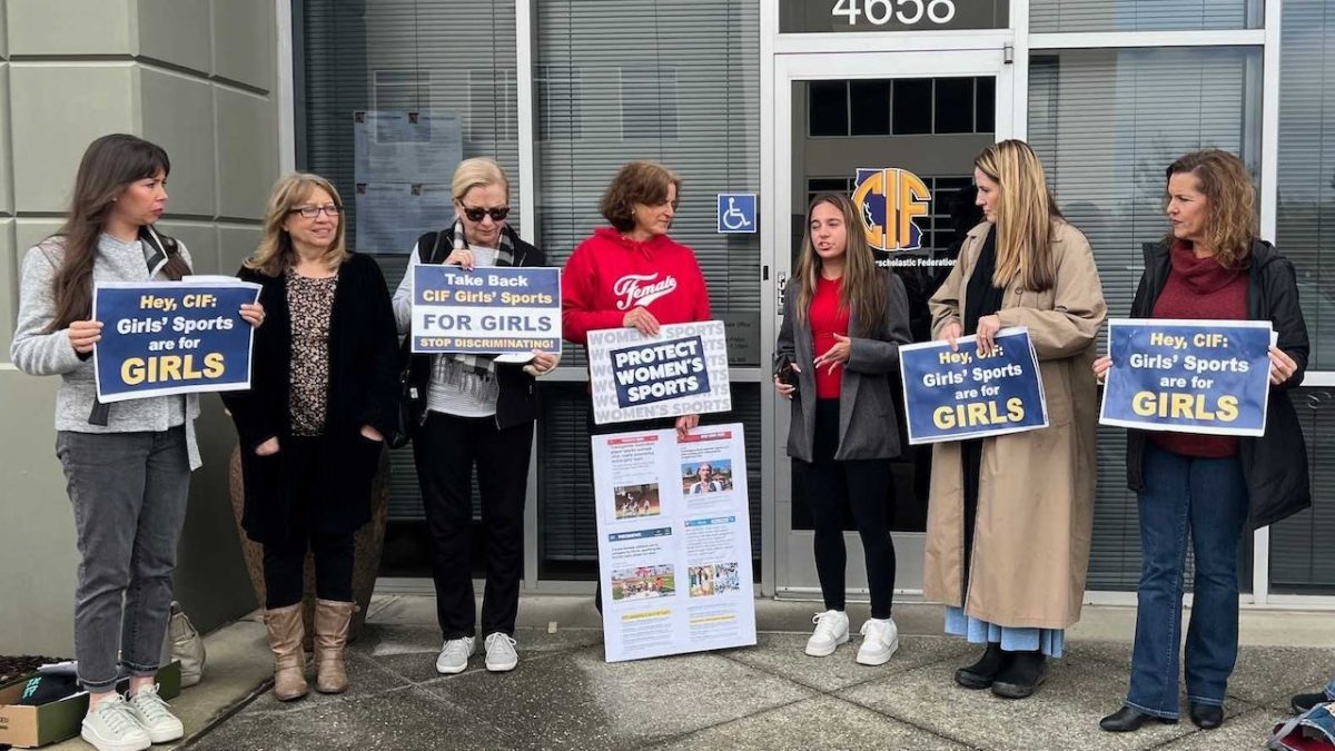 Protesters gather outside the Inter-Calif. Federation of Governance Bureau to advocate for female athletes' protection against transgender athletes. (Personally courtesy of Beth Bourne)