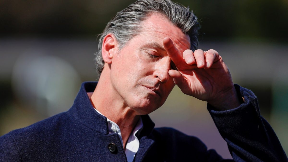 Governor Gavin Newsom pauses during a press conference after touring Barron Park Elementary School on March 2, 2021 in Palo Alto, California. (Justin Sullivan/Getty Images)