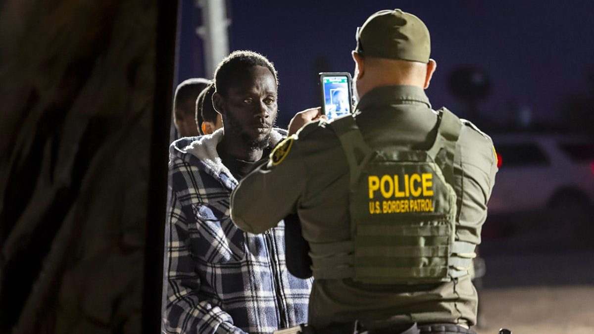 Migrants are photographed at a U.S. Border Patrol processing center after crossing the U.S.-Mexico border in Lukeville, Arizona, on December 7, 2023. (John Moore/Getty Images)