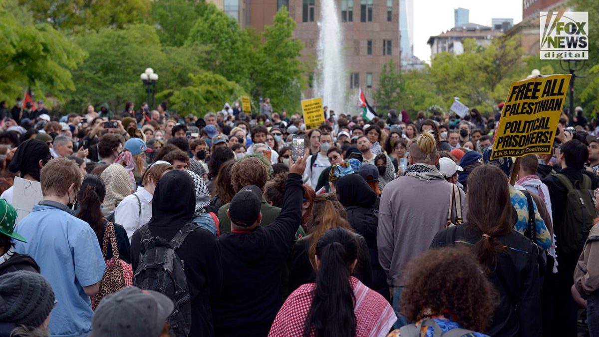 Anti-Israel demonstrators gather in Washington Square Park on May 3, 2024 in New York City. New York University’s Palestine Solidarity Coalition organized the demonstration. (Rashid Umar Abbasi, Fox News Digital)
