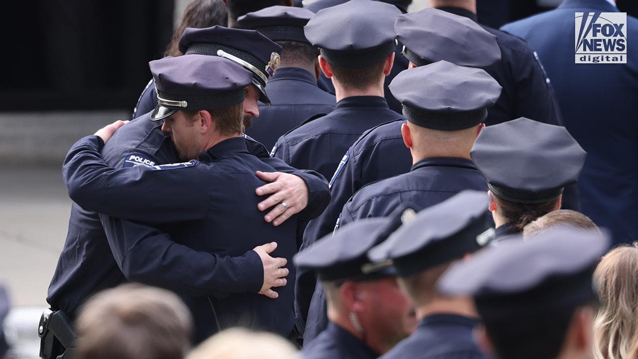 Police console each other at the memorial for fallen CMPD Officer Joshua Eyer at First Baptist Church on Friday, May 3, 2024 in Charlotte, North Carolina. Charlotte Mecklenburg Police Officer was one of four officers shot and killed on Monday, April 29th. She was attempting to execute a warrant for a wanted suspect in east Charlotte. (Fox News Digital Image Direct)