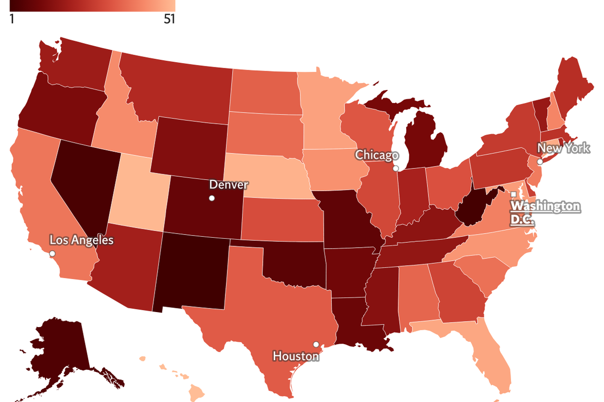 The analysis utilized data from various federal agencies, including the U.S. Census Bureau and the CDC, assigning scores on a 100-point scale to rank the states from best to worst. New Mexico emerged as the most problematic state, followed closely by West Virginia, Nevada, Alaska, and the District of Columbia. The top ten included Oklahoma, Missouri, Colorado, Louisiana, and Arkansas.
