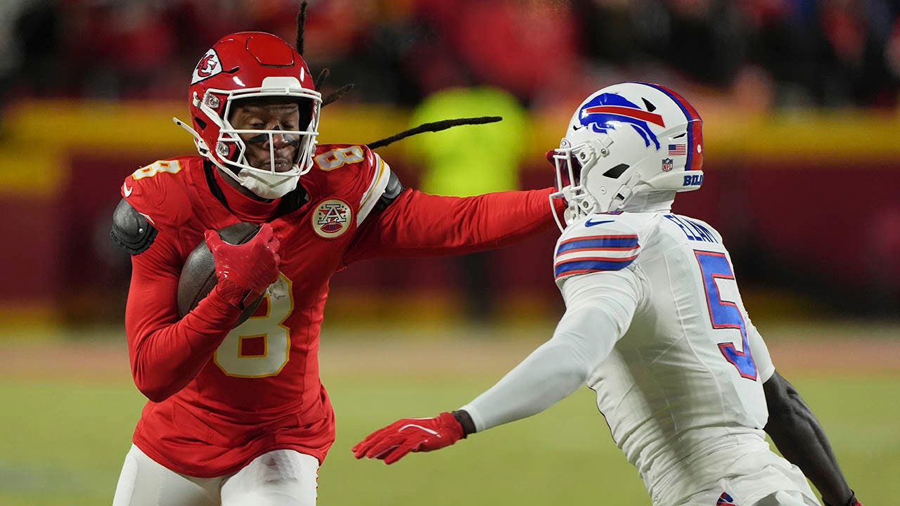 DEANDRE HOPKINS, Chiefs Wide Recever, will run after Buffalo Bills corner back Kaiir Elam during the AFC championship game on January 26, 2025. (AP photo/Charlie Leadel)