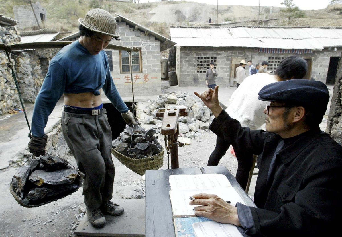 Chinese villagers weigh antimony ore from an illegal mine in the Lengshui River. China is now restricting exports of the substance.