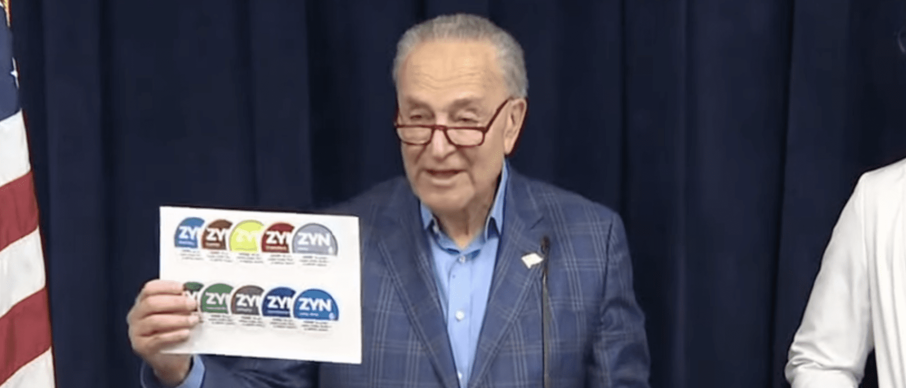 On Sunday, Schumer called for a federal crackdown on Zyn, claiming the product is highly addictive and stunts brain development in teen users. Here’s the longtime anti-nicotine tyrant at the presser, flanked by his super serious-looking Big Pharma foot soldier: