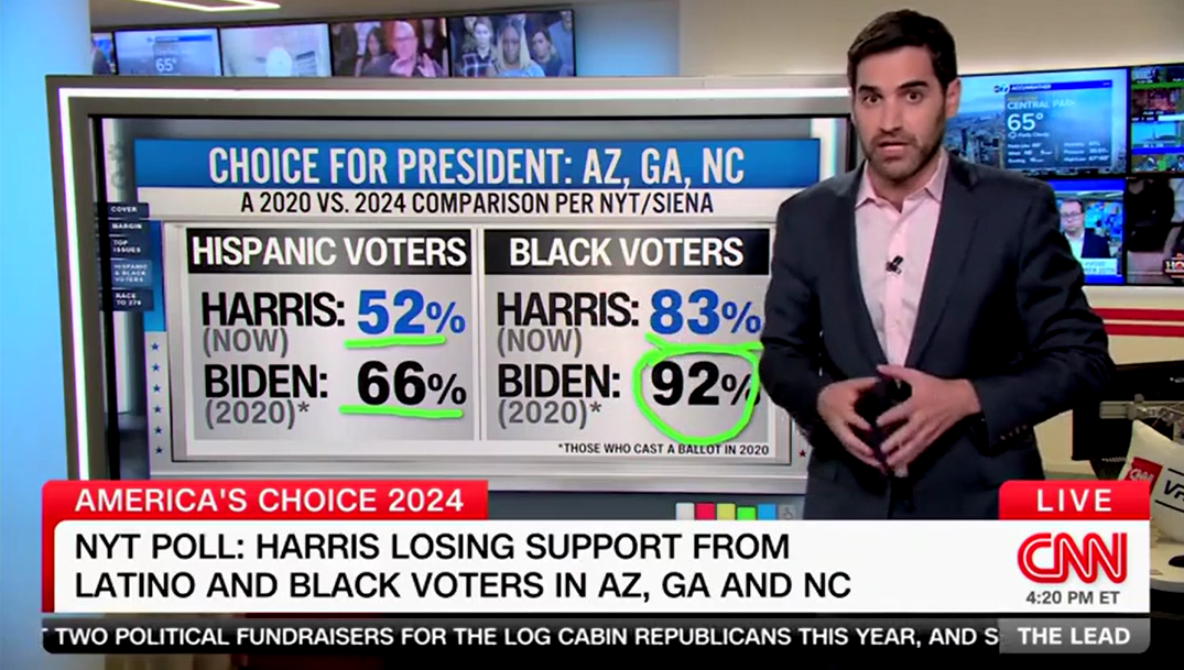 “What about black voters,” Enten continued, “Kamala Harris is leading by a large margin again, right? She's got 83% of the vote, well behind Joe Biden's 92%.”