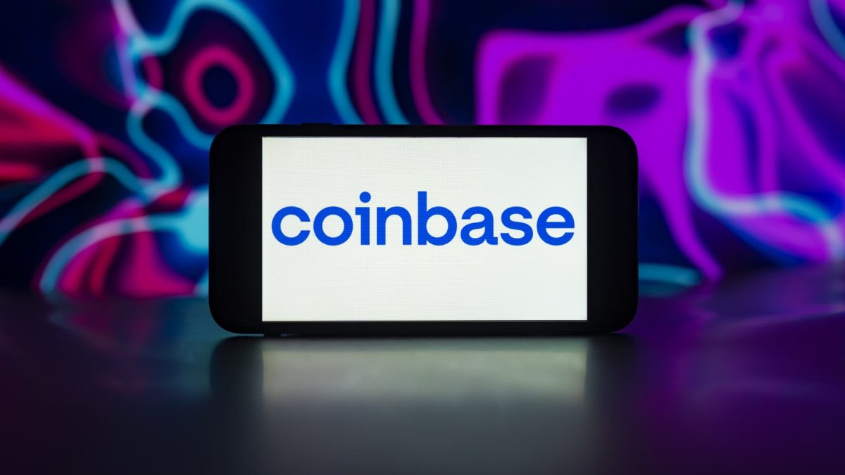 In this illustrated photo, the Coinbase logo is displayed on a mobile phone screen.