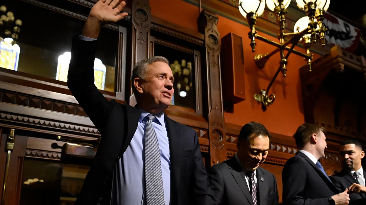 Democratic Gov. Ned Lamont waves after delivering the State of the Union address on February 7, 2024 in Hartford, Connecticut. (AP Photo/Jessica Hill)