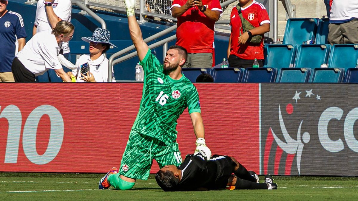 Canada’s Maxime Crepeau assists assistant referee Humberto Panjoy during the Copa America match between Peru at Children’s Mercy Park on June 25, 2024 in Kansas City, Kansas. (Jamie Squire/Getty Images)