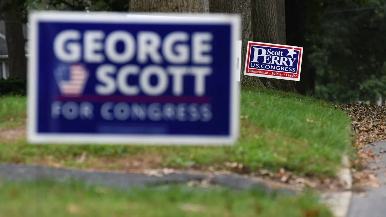 FILE – Campaign signs for Republican U.S. Rep. Scott Perry of Pennsylvania and Democratic challenger George Scott are seen on a neighborhood street in their Camp Hill, Pennsylvania, district on Saturday, Oct. 6, 2018. It says a small Pennsylvania town ordinance aimed at reducing lawn signs is unconstitutional and that the resulting restrictions on political lawn signs violate residents’ free speech rights. (AP Photo/Marc Levy, File)
