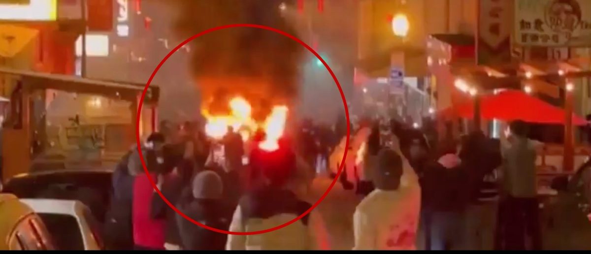 Two men broke a window and one of them appeared to use a skateboard to crash into a car multiple times, and people in the crowd were seen filming the incident. Other videos later showed the car burst into flames as a crowd formed around it. (Related: San Francisco Mayor, California Democrat Becomes Latest to Back Ballot Measure That Tightens Penalties for Retail Crimes)