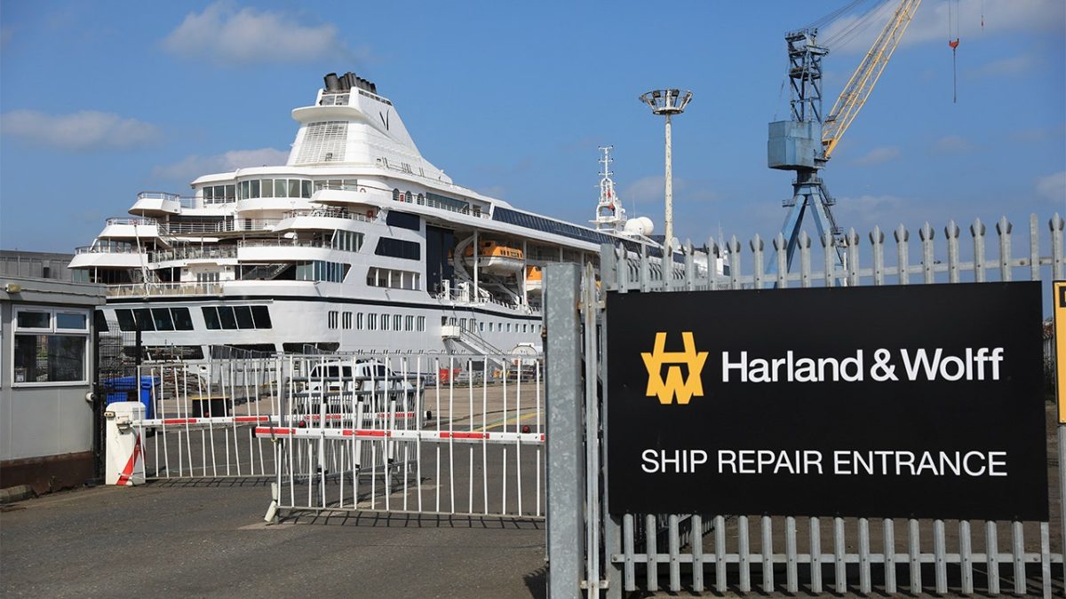 The U.S. cruise ship Odyssey, operated by Villa Vie Residences, undergoes repairs at Harland and Wolff's ship facility in the port of Belfast, Northern Ireland, Friday, Aug. 30, 2024. (AP Photo/Peter Morrison)