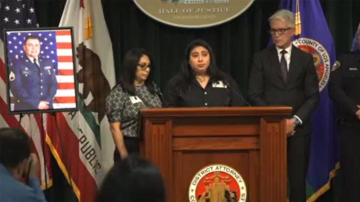 Fernanda Sandoval (center) speaks about her father near a photo of her father, a military veteran, as prosecutors announced charges against four suspects in her father’s murder in Los Angeles on Thursday. (Fox News)