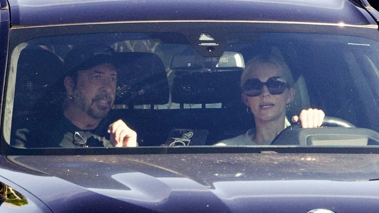 Grohl threw his glasses into the collar of his black shirt and wore a matching black baseball cap. Blum was dressed in a light gray sweater and protected his eyes with his big black sunglasses.