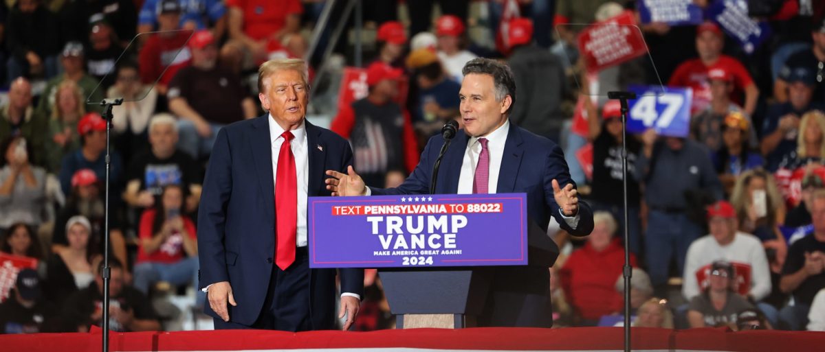 Republican Senate candidate Dave McCormick is watched by former President Donald Trump during a campaign rally at Lancaster Airport in Lititz, Pennsylvania on November 3, 2024. (Photo by Michael M. Santiago/Getty Images)