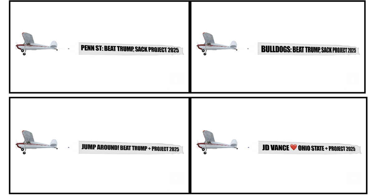 College football fans attending the four high-profile games in Week 2 will see something very different in the skies above stadiums in key battleground states: The Democratic National Committee plans to fly planes bearing banners reminding fans of the Republican presidential candidates' ties to Project 2025, while also poking fun at Michigan State's J.D. Vance.