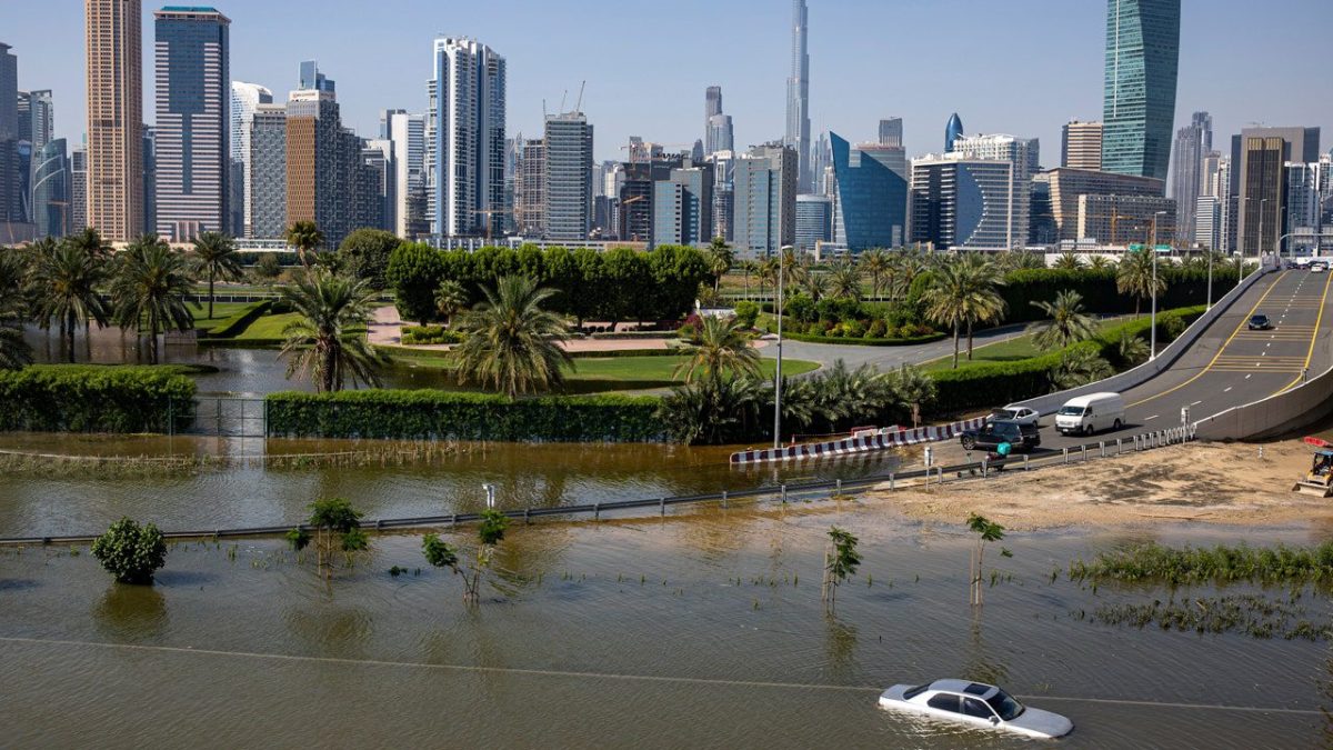 An abandoned vehicle stands in floodwaters that cover a main road after a severe thunderstorm in Dubai, United Arab Emirates, April 18, 2024. (AP Photo/Christopher Pike, File)